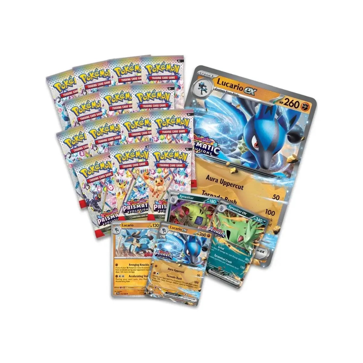 The bravery of the Fighting type and the tenacity of the Darkness type combine in this power-packed collection of Pokémon promo cards and booster packs! Here you'll find specially stamped foil promo cards featuring Lucario and Tyranitar, including as Pokémon ex, plus an oversize foil version of Lucario ex to show off. Then, discover even more Pokémon inside a stack of 14 booster packs from the special Scarlet & Violet-Prismatic Evolutions expansion!