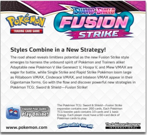 The road ahead reveals limitless potential as the new Fusion Strike style emerges to harness the unbound spirit of Pokémon and Trainers alike! Adaptable new Pokémon V like Genesect V, Hoopa V, and Mew VMAX are eager for battle, while Single Strike and Rapid Strike Pokémon loom large as Rillaboom VMAX, Cinderace VMAX, and Inteleon VMAX appear in their Gigantamax forms. Go with the flow and discover powerful new strategies in Pokémon TCG: Sword & Shield—Fusion Strike!