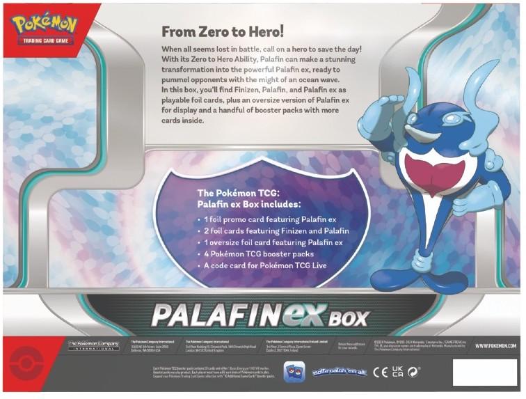 When all seems lost in battle, call on a hero to save the day! With its Zero to Hero Ability, Palafin can make a stunning transformation into the powerful Palafin ex, ready to pummel opponents with the might of an ocean wave. In this box, you’ll find Finizen, Palafin, and Palafin ex as playable foil cards, plus an oversize version of Palafin ex for display and a handful of booster packs with more cards inside.